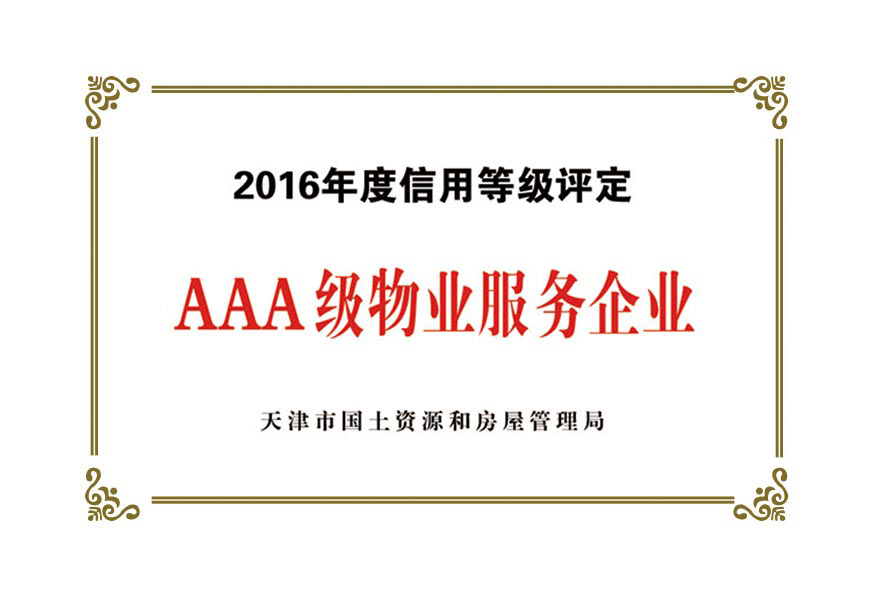 公司目前被授予:中國保安協會理事單位、物業管理綜合實力入圍企業、天津市物業協會理事單位、天津市保安協會常務理事單位、天津市保潔協會明星企業、天津市科技小巨人企業、天津市科技型企業、天津市物業管理企業優(yōu)秀項目經理、企業信用評價體系AAA級企業、AAA級誠信經營示范單位、AAA級重合同守信用單位、2017年被天津市工商業聯合會評為天津市民營企業促進就業百強企業、社會捐贈百強企業、2018年銷售收入百強企業,2020年被天津市退役軍人事務局評為天津市吸納退役軍人就業先進單位。